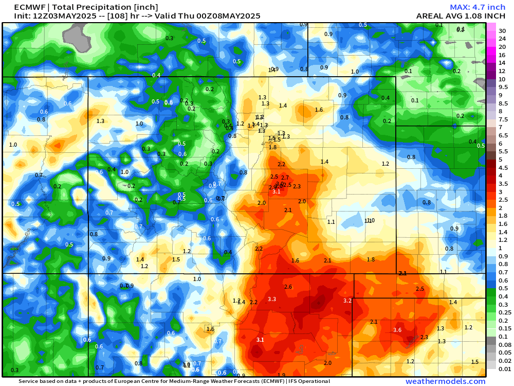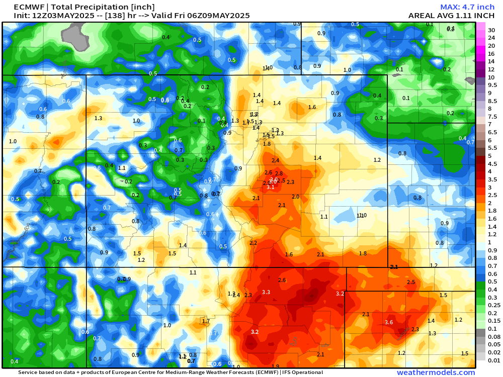 As seen on the precip charts, theres the potential for up to an INCH of liquid across a large chunk of eastern Colorado. This would be VERY welcome moisture as much of the spring so far has been much warmer and drier than normal.