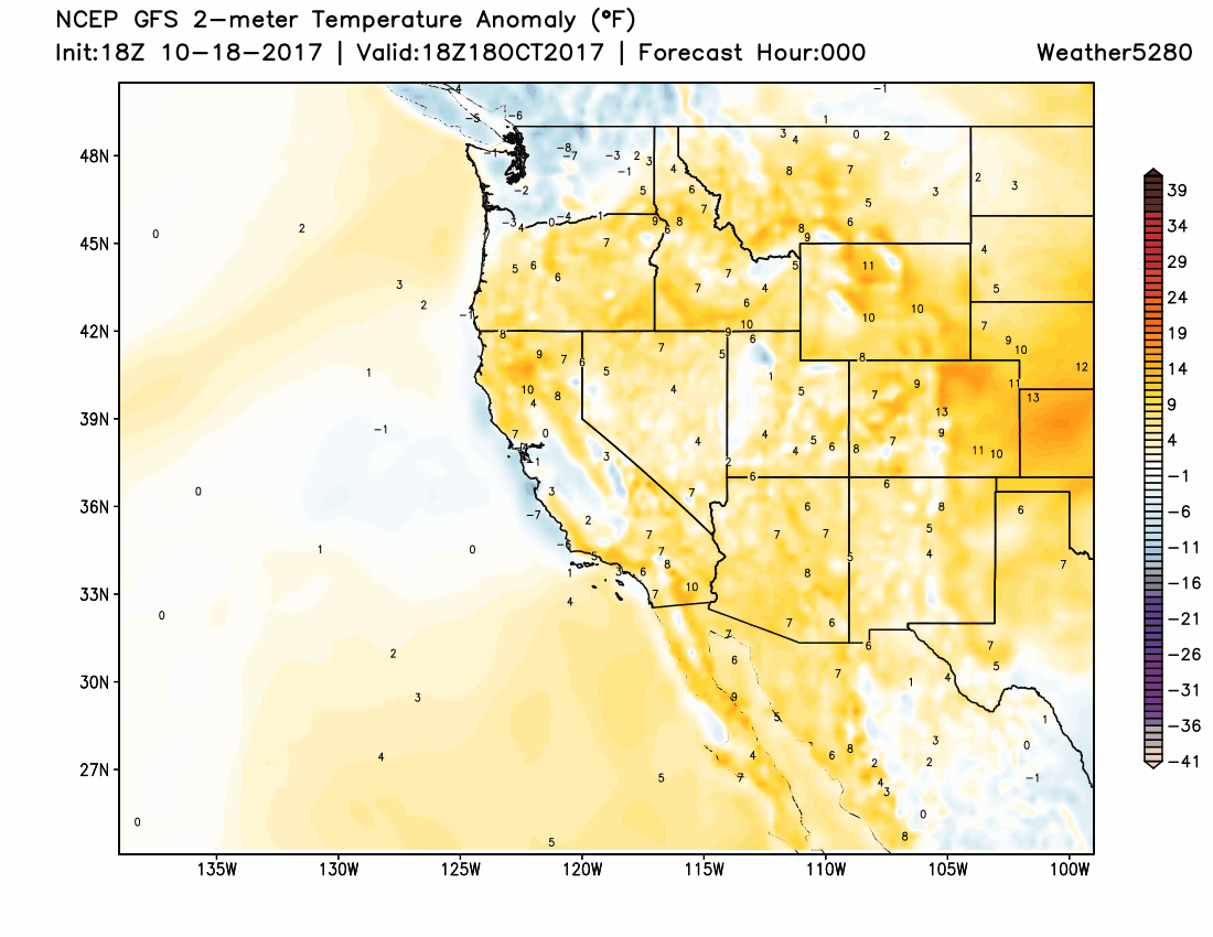 That blue coloration represents temperatures 5 to 10 degrees cooler than the average. This will push the Denver area temperatures into the upper 50s and lower 60s for highs Saturday.