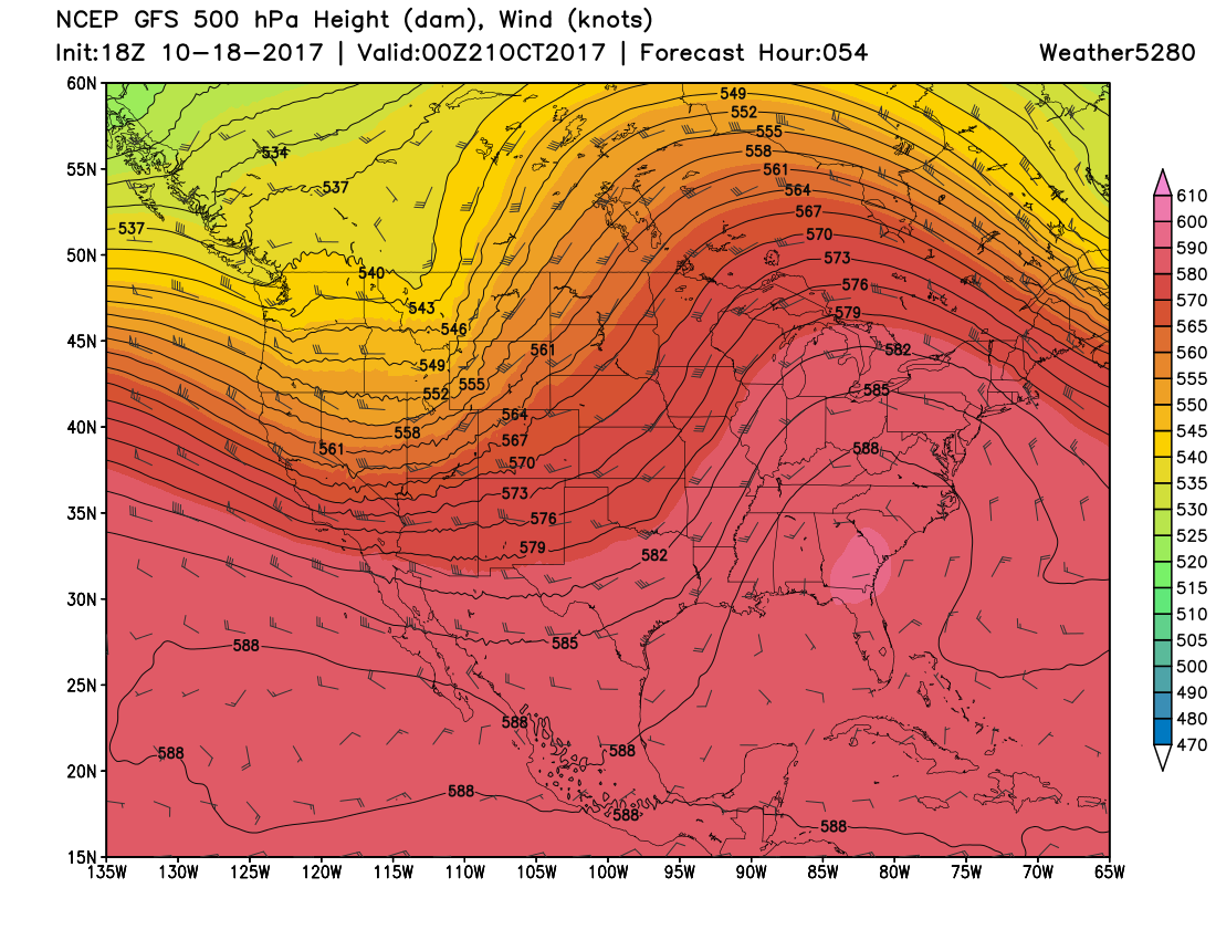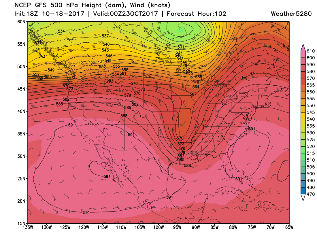 The GFS snapshot of the middle atmospheric pattern Friday evening shows the trough sitting west of Colorado: