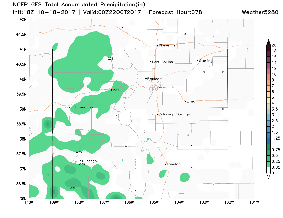 Should this scenario play out, it will be possible to have some minor snow accumulation within the metro areas - mostly on the Palmer Ridge between Denver and the Springs. Again, though, to see this change will require a lot of change to the system which isn't all that likely.